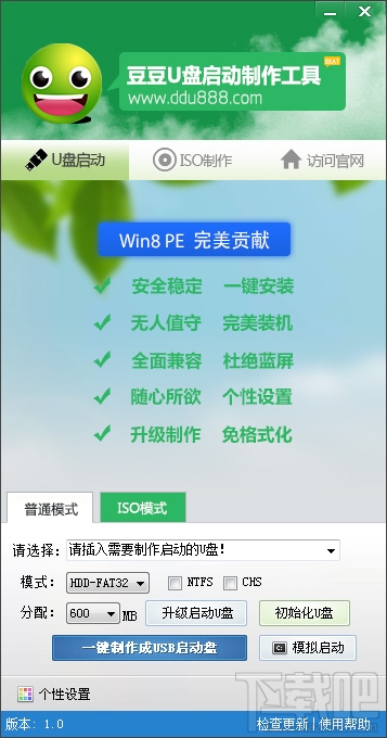 1、真正的快速一键制作万能U盘启动,所有操作只需要点一下鼠标,操作极其方便简单,一键快速完成u盘装 系统。 2、u盘启动系统集成豆豆精心制作和改良的PE系统,真正可以识别众多不同硬盘驱动PE系统,集成u盘装系 统,硬盘数据恢复,密码和谐,等等实用的程序。 3、自定义启动u盘装系统加载,只需在豆豆官网或其他网上找到各种功能的PE或者其他启动系统,只需要制 作时添加一下,自动集成到启动u盘装系统中。 4、u盘装系统时U盘启动区自动隐藏,防病毒感染破坏,剩下的空间可以正常当U盘使用,无任何干扰!