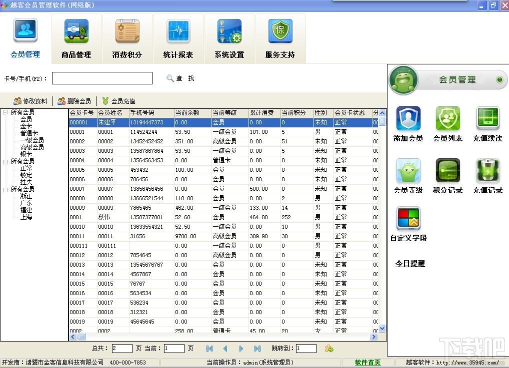 本软件界面清新、操作简便,无需专业培训即可轻松掌握,加之丰富的文档教程以及完善的客户服务体系,能随时解决使用过程中遇到的任何问题。 越客会员管理系统是您实现会员制信息化管理的不二之选! 会员管理功能 1、完整的会员属性设置,全面记录会员信息; 2、灵活的会员分类和等级设定(不同等级可设置不同的折扣率以及积分兑换比例),满足对不同会员的管理需求; 3、轻松实现换卡、锁定、挂失、转账、生日提醒、短信发送等功能; 4、强大灵活的“自定义属性”功能可满足不同行业需求; 5、会员照片功能记录会员头像,以及会员卡密码功能,以免冒名顶替; 6、Excel批量数据录入,大大提升操作效率; 7、另有会员推荐制功能,让老客户主动为您带来新客户; 8、一张卡集积分、折扣、计次等多功能与一体; 消费积分功能 1、根据消费金额自动折扣金额和积分数量; 2、多种计算方式相结合(余额支付、现金支付、信用卡支付、代金券、联合支付); 3、积分兑换不同礼品,给会员实实在在的好处,提高会员消费积极性; 短信群发功能 1、强大的短信群发功能支持普通发送、批量会员发送、系统短信发送多种模式; 2、生日祝福、节日问候、促销信息第一时间到达会员手中,既彰显对客户的关怀,且能开发潜在客户; 3、消费、充值、兑换短信自动发送,类似银行取款自动短信提醒功能,更显专业; 统计报表功能 1、会员数据、消费数据、积分数据、充值数据完善的统计功能,让您随时掌握最准确的经营数据; 2、报表方便的导出到Excel、PDF等文件; 3、方便的报表打印功能,满足办公所需; 系统设置 1、多操作员模式,不同操作人员不同操作账号,不同操作权限,方便人员管理; 2、针对会员、产品、消费、积分、短信、打印、IC卡等进行综合的管理设置; 3、强大的日志功能,记录操作人员的每一部操作; 4、数据库自动备份功能确保数据万无一失;