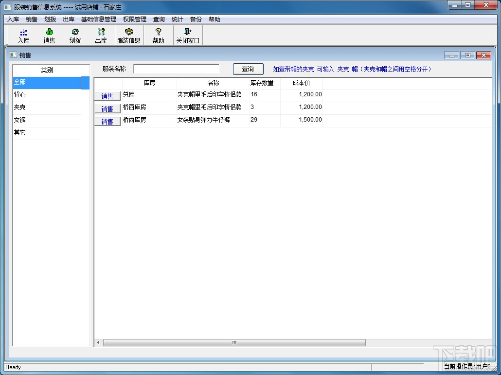 7.77 MB/2020-08-17佳易服装鞋帽销售管理软件是一款优秀专业的适用于服装管理、鞋帽管理、箱包管理等行业管理的进销存管理软件,佳易服装鞋帽销售管理软件界面美观、易学易用、操作简便、功能实用、性能稳定。佳易服装鞋帽销售管理软件具备供货商、客户、员工、商品、分仓库存、批发、零售、会员制、财务、查询统计等全面的管理模块,适合批发、零售、专卖店等。佳易服装鞋帽销售管理软件功能特点:1、采用标准、一致的程序界面,简洁、直观、操作方