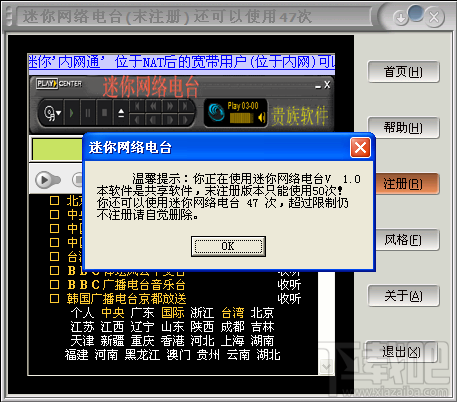 396 KB/2020-08-17上网听广播软件可以收听免费网络电台400多个,只要在电台名称上双击就可以了。正常收听需要系统安装windowsmediaplayer9.0以上版本。某些网络电台服务器不稳定,可能会无法收听