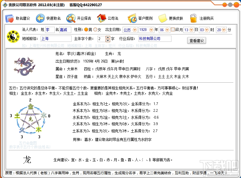 贵族公司起名软件根据企业老板的生辰八字分析出五行情况,找出五行流通所缺链条,加以补之,使之五行血液敞通,贵族公司起名软件根据企业老板的生辰八字分析出财源据点,用八字反补法加以巩固,使之商业经营百战不贻,贵族公司起名软件根据企业老板的生辰八字分析出风险据点,用乾坤转移法避而远之,使之企业扩张化险为零,贵族公司起名软件根据企业老板的生辰八字分析出战略据点,用阴阳互补法交感运动,使之品牌战略规划旗开得胜。