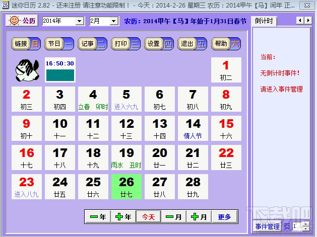迷你日历是集公历农历(1600-2100年)双界面对照查询、每日记事、周期式活动预排、人体生物节律、重要记事动态提醒、闹钟报时、世界各地时间查询、自定义节日、节日预告、倒计时、日历墙纸、日历打印和多种日历信息(节气、交节时刻、各种类型节日、九九、三伏、星座、梅雨季节、四季、生肖、四柱、时辰等)查询及个人信息管理于一身的多功能日历软件,同时它还具有极强的个人信息管理功能。