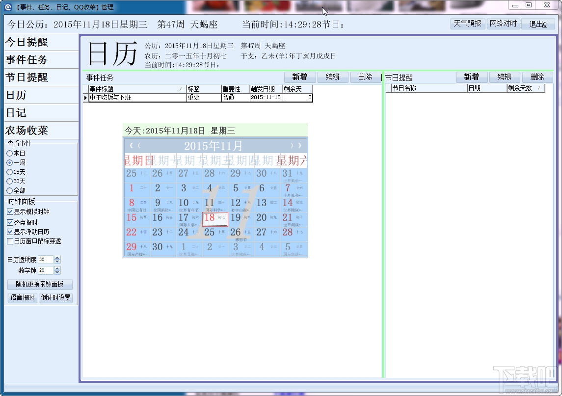 15.72 MB/2020-08-17这是一个忙碌的时代!这是一个充满激情的时代!我要让我的工作和生活井井有条,面对再多的约会、会议和事务安排我都能从容面对!因为,我拥有效能日程提醒软件!有了她的帮助,会议我从不迟到;和恋人约会,我能让她惊喜;每月电话费能及时缴纳;妈妈的农历生日我能及时准备;甚至某个节气将至软件也可以提醒我!通过直观的天、工作周、周、月或者年的日历视图,对哪天将要有什么事情一目了然;我也可以通过列表形式查看事件。软件