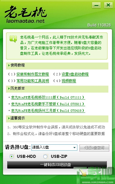 老毛桃U盘启动盘制作工具不需要任何技术基础,一键制作,自动完成制作,平时当U盘使用,需要的时候就是修复盘,完全不需要光驱和光盘,携带方便。老毛桃U盘启动盘制作工具是一款电脑应急,工具齐全,最给力的帮手!U盘是病毒传播的主要途径之一,老毛桃引导盘采用写入保护技术,彻底切断病毒传播途径。光盘和光驱系机械产品,容易划伤和损坏;U盘可达5万次读写次数,USB2.0高速传输,整个过程不到10分钟。自制引导盘和光驱无法更新系统,老毛桃引导盘用户可以自由替换系统,支持GHOST与原版系统安装,方便快捷,自动安装。支持双显卡笔记本的引导进PE,防蓝屏新技术,旧电脑智能加速,原来20分钟 进PE的2分钟完成。