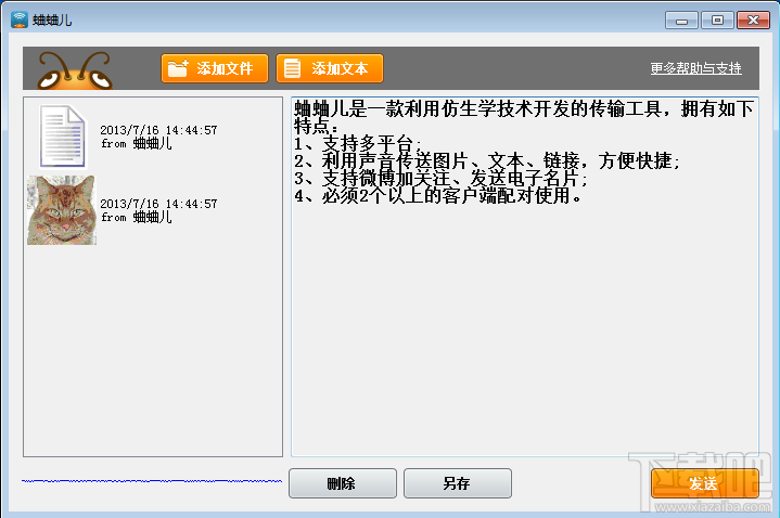 “蛐蛐儿”采用仿生学技术,利用声音实现文件的快速传输。采用跨平台的技术,实现手机与PC之间,或者手机之间的图片、文字、链接的传输,同时社交功能实现了微博加关注、电子名片交换等功能。