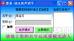 幼儿有声识字完整版软件特点是可以用鼠标拾字,那里不会读哪里!当你把鼠标移到有汉字的地方,就会 自动读出那段文字,支持多音字、繁体字;本软件可以自定义多音字,可以修改文库,默认有三字经、 增广贤文等等,支持语速(两个字的间隔发音时间),重读次数,用做阅读时,可以男女2种声音对读 (每人一句的读),里面还有练习功能,可以描红练习写字或空白米字格写字。有智能生熟字处理,在 阅读时可以双击一个还未读到的字即可变换生字或熟字,分别由不同颜色来区分,可以自定义颜色、背景,还有听写选择题功能,给出汉字找拼音、或给出拼音找汉字。