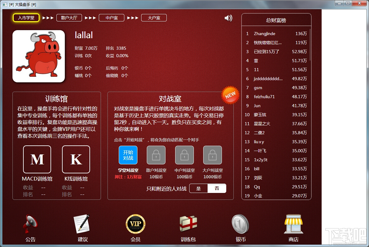 史上较好的操盘手训练工具,华尔街培养高级操盘手的系统方法, 针对A股特殊优化的双盲训练,有效提升盘感,迅速提高炒股水平,真人PK对战,和强手对决,向高手学习操盘手法,“大操盘手”上线之后,收到很多股民用户的反馈,表达了对大操盘手的喜爱,也对新版本提出了更高的要求。我们真心地感谢大家对我们的支持和厚爱,一定会更加努力用心的打造更加完美的大操盘手,帮助您在真实市场赚钱。 新版本在保持原有的专业、有效、刺激、有趣的核心价值的基础上,提供了以下新功能:高手对战:根据真实的历史数据,进行对战。