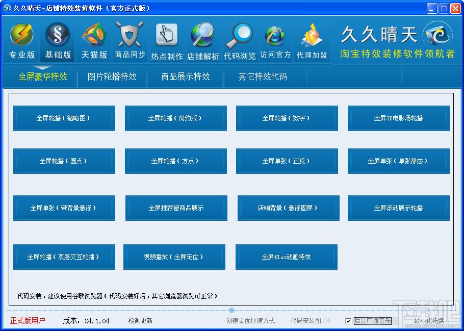 淘宝店铺特效装修软件,官方正式版,免费试用,美工必备,店铺装修助手/助理 组合70多种特效代码生成功能, 包括全屏轮播,店招,导航,分类,商品展示,各类图片轮播等 商品信息自动导入,自动批量填充功能。