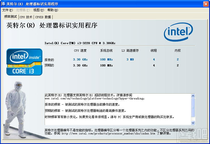 英特尔(R)处理器标识实用程序由英特尔公司提供,使客户得以识别英特尔微处理器的品牌、特性、包装、设计频率和实际操作频率。 客户还可使用本实用程序来辨别英特尔处理器是否超出英特尔额定的频率在操作。