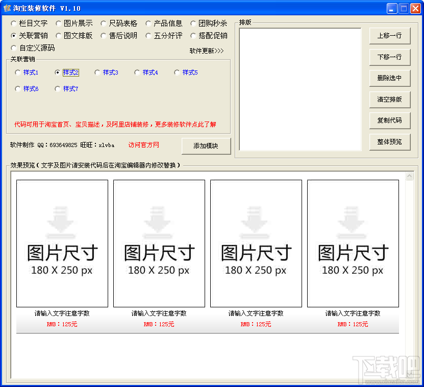 淘宝装修软件可用于首页或商品详情页装修 分栏标题,图片展示,商品关联,团购,搭配等多种模块组合,多样式自由搭配装修。