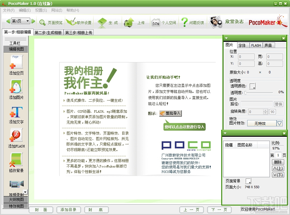 PocoMaker魅客电子杂志生成器以电子杂志、电子相册、电子读物等诸多电子读物制作为主,并能上传至PocoMaker个人空间,展示自我个性,入门只需五分钟。