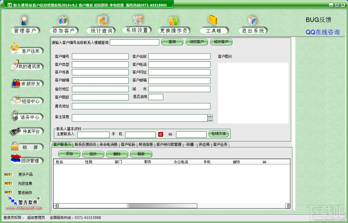 客户管理是所有经营单位最常用,最重要的业务管理,企业竞争的关键就在于客户的竞争。智方3000系客户管理软件(包括了客户关系软件,短信群发软件,客户回访软件,CRM软件,客户管理软件)是一款简洁、易用、实用的客户信息管理软件,是智方软件技术团队推出的最常用最普及的工具软件之一.软件功能包含客户管理、添加客户 、统计查询、系统设置、操作员管理、客户业务往来管理、客户维系管理、客户提醒管理,短信中心,等等。并附之简洁的通讯录、便签本、随手计算器等附属功能。该款软件界面设计简洁,直观,软件操作流程充分考虑到了人性化操作习惯,使普通用户不需培训,打开软件即可很快上手使用。集成的查询统计功能能够满足客户对相关数据报表的即时查询打印,所有功能均在用户习惯需要的地方自然体现。智方3000系客户管理软件可满足大多数企业的客服部、销售部等客户相关管理部门,实现对客户信息登记,客户信息查询,客户消费统计,客户维系管理,客户业务汇总,客户效益分析,使管理者对客户信息一目了然,为增强客户服务工作提供直接依据。智方3000系客户管理软件一定是广大经营者加强客户管理的常用手边工具软件!