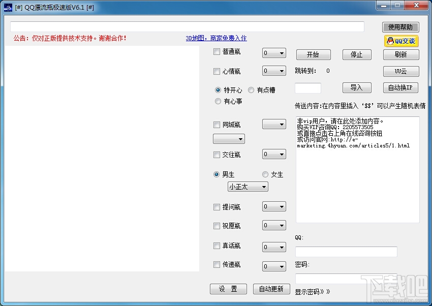 QQ漂流瓶极速版是一款专门针对网络营销人员开发的软件,开发者本着“个性化操作用户做,重复性操作软件做”的原则,让软件在省时上达到完美:网络正常的情况下20来个账号的任务只要几分钟就能完成,让你的推广更轻松,更愉快。