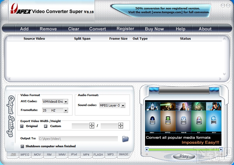 Apex Video Converter Super是一款强大的视频格式转换软件,它支持MOV,MPEG,VCD,DCD,WMV,ASF,RM,RMVB,AVI,DIVX等各种格式文件之间的转换,它转换速度快,用户界面友好。