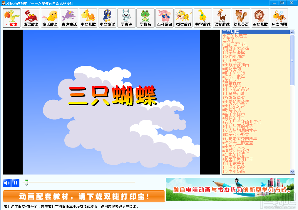 双捷动漫播放宝精心挑选和分类千个动漫故事包括小故事,成语故事,童话故事,神话故事,中文儿歌,中文童谣,学古诗,学拼音,百科常 识,益智游戏,数学游戏,语文游戏,幼儿英语,英文儿歌,14个单元。让儿童在看故事的过程中,获得大量的知识和快乐。 边玩边学,完成动漫游戏相应的课程在配套的双捷打印宝中打印出来,和孩子一起互动,边回忆游戏边做练习,锻炼孩子思维能力和记忆力同时还学习了新课程。