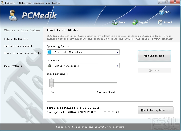 PCMedik可以优化你的电脑,让PC发挥更大的性能,大大减少死机的事件。你只须选择操作系统的类型和CPU名字,再点击[GO]按钮就会完成全部的优化设定。