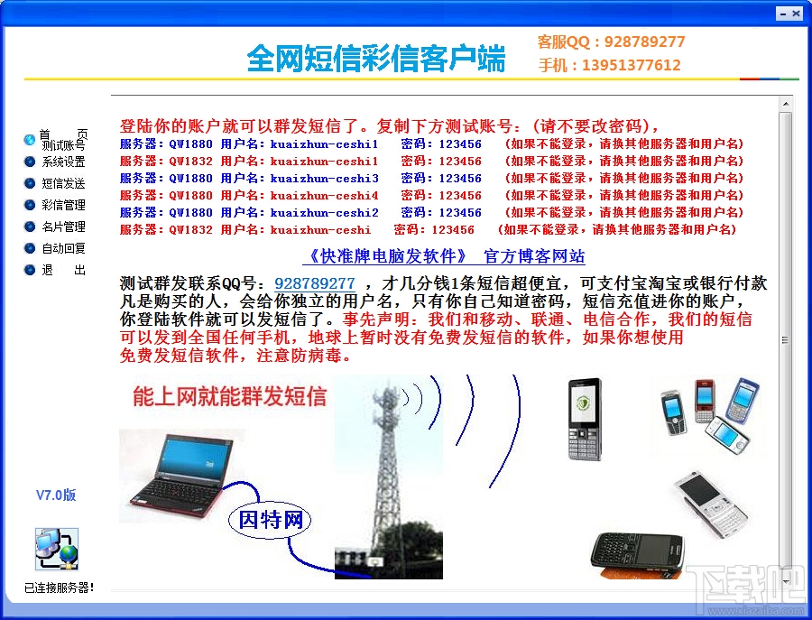 全网短信彩信客户端版以系统稳定为核心,整个短信发送过程客户可以在线看到发送状态,我们力求做到透明、实时、稳定 。该系统与电信,联通,移动等运营商保持了良好的合作关系,支持移动、联通、电信号码、小灵通全网发送。