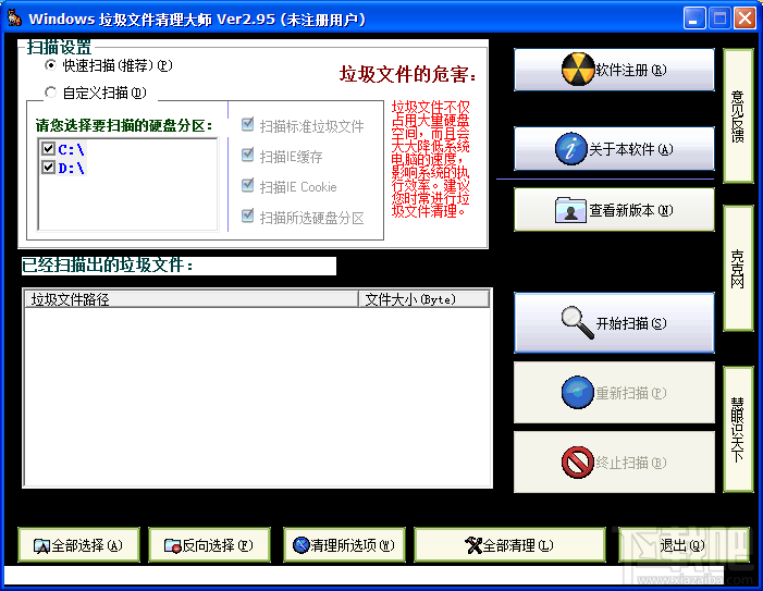 电脑用上一段时间会产生许多垃圾文件,这些垃圾文件不仅占用大量的硬盘空,而且还会严重影响电脑的运行速度和系统的执行效率,Windows垃圾文件清理大师是专门为清理电脑的垃圾文件而设计的,它会使您的臃肿的系统变回一个健康清洁的系统!