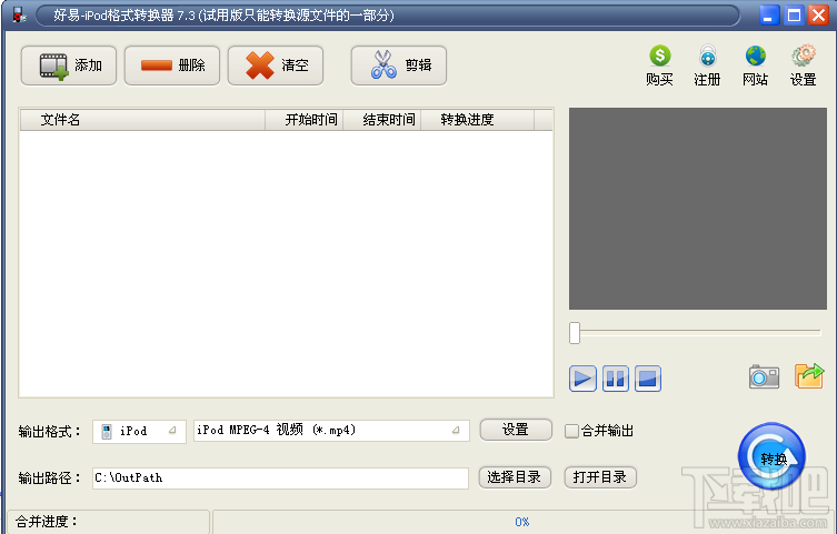 好易iPod格式转换器试用版界面友好,易操作,功能强,可以高速地将各种主流视频格式,如RM、RMVB、VOB、DAT、VCD、SVCD、WMV、ASF、FLV、MKV、MOV、QT、MPEG、AVI、MP4、3GP等格式,编辑转换为苹果iPod nano、iPod classic、iPod touch等支持的音频和视频格式,支持输出H.264高清编码MP4,并支持从视频中分离输出音频M4A、AAC、MP3、MP2、WMA、AMR等格式。对于不常见的高清视频、MTS、MOD、TS、M2TS均能进行转换。
