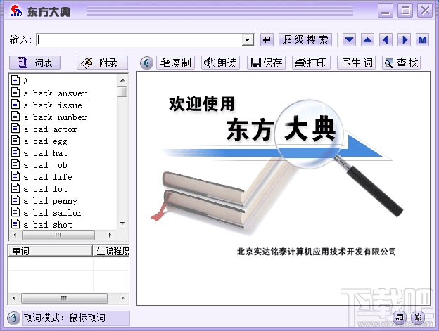《东方大典Ⅱ专业版》一款为您学习外语量身定造的工具软件,它不但继承了《东方大典XP》的优点,解决了原有的一些问题,而且在此基础上继续创新,把东方大典推向了一个新的阶段,它的特点有:可以实现英文翻译中文,中文翻译英文,日文翻译中文,中文翻译日文等十向翻译。支持多种格式的抓词,还可以实现图片抓词。真人发音让您能够学到一口地道的美国英语。新词更新可以随时让您拥有新的词库,永不落伍。想背就背让您在随时随地都可以记忆词汇,并且更符合您的使用习惯。嵌入功能让您在使用WORD和IE的时候,不用启动大典,同样可以取词。整句翻译和朗读,让您轻松学会地道英语单句。拖拽查词功能,使您连单词都不用输入就可以查询生词的解释。生词本功能,让您更方便的学习单词。