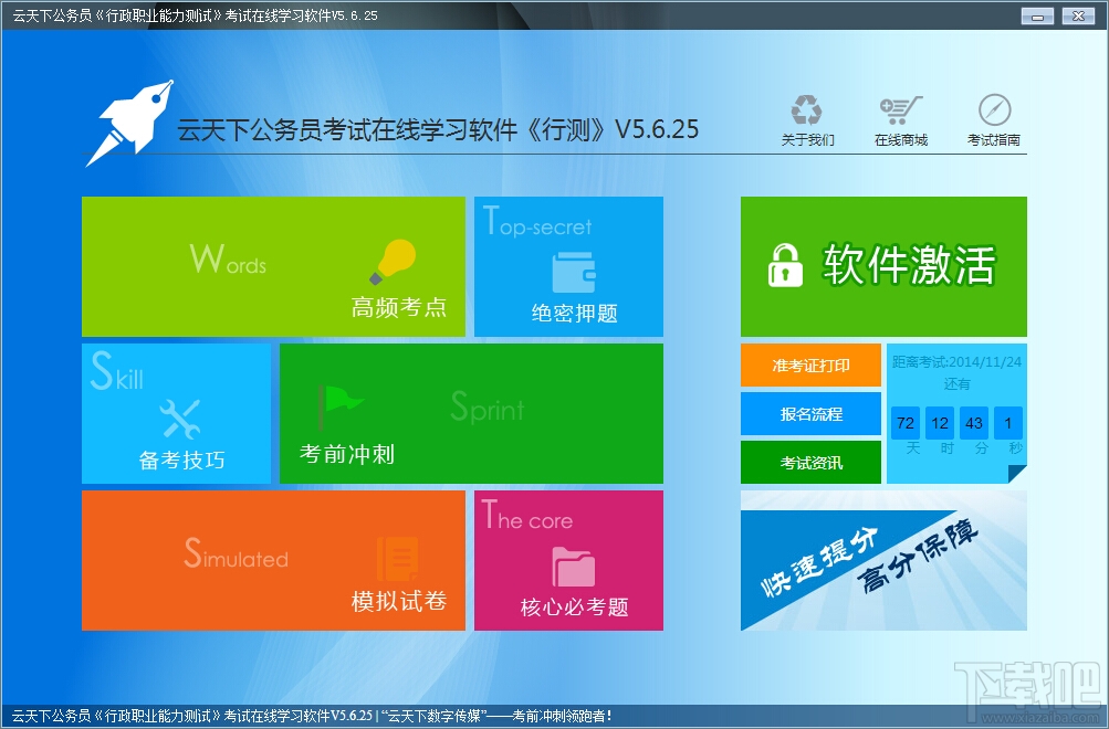 云天下特设计本学习软件,其主要功能有①考试日期记录及提醒;②考试科目的资讯、动态、相关工具;③在线阅读考试重点内容;④在线考试、判分,及考题收藏、笔记、错题重做;⑤实现个人学习数据的云同步。其目的在于为广大的考生提供个性化的在线学习服务。