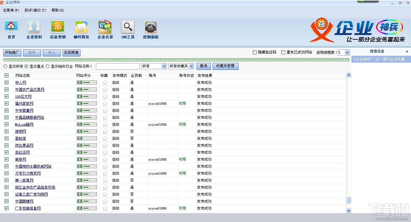 企业神兵是一款企业营销推广软件,是企业推广的神兵利器,主要功能:供求群发,商贸群发,微博群发,邮件群发,企业搜索,求购搜索。