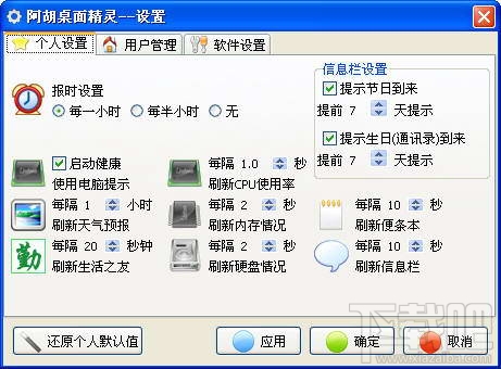 本软件由专业的阿胡工作室倾力打造,无广告,绿色免费. 多用户功能,各用户设置信息分别保存,满足多方需求. 拥有11个可自由调整的功能窗口,如5天天气预报,日历,CPU使用率等. 软件拥有数十款(不断增加中)各种功能窗口的皮肤,总有几款适合您. 通讯录功能,可方便的管理查找联系人,提前提示某人生日,方便您的人际关系管理. 壁纸自动换,能定时更换壁纸,不再老对着一成不变的面孔. 节日提示功能,能提前N天提示您节日的到来,还可以添加自定义节日. 任务管家功能,可设定在任何时候弹出提示、关机、打开文件等. 软件内附简单易用的皮肤制作工具,能轻松DIY您想要的卡通、偶像皮肤. 阿胡工作室网站(www.ahu-office.com)有大量的精美皮肤下载.如您想展示自己制作的皮肤,可打开皮肤制作器了解发布详情. 感谢您阅读此软件说明,愿您能体会到使用本软件的乐趣.