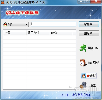 QQ淘宝在线查看器功能如下:不用登录qq、阿里旺旺也可以知道对方在不在线,QQ在线查看器 好友上下线提醒,输入对方QQ,点击“增加”即可,可设置自动刷新,聊天工具支持:腾迅QQ,淘宝旺旺,阿里巴巴贸易通,对方上线下线可即时提醒。