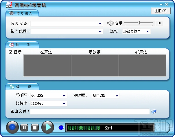 MP3录音机是一款功能强大的高清音质MP3录音编码软件。支持48KHz采样率,从32Kbps到256Kbps比特率压缩编码,轻松实现从语音音质到高清数字音频音质的录音编码。支持麦克、CD、线路(Line in)、数码输入线路选择。波形分析器能够实时显示音频信号强度。软件音频编码细腻清晰,可用于教学录音、会议录音、QQ聊天录音、音乐会录音、Party录音、歌唱录音等,也可用于磁带数字化转换和广播录音。