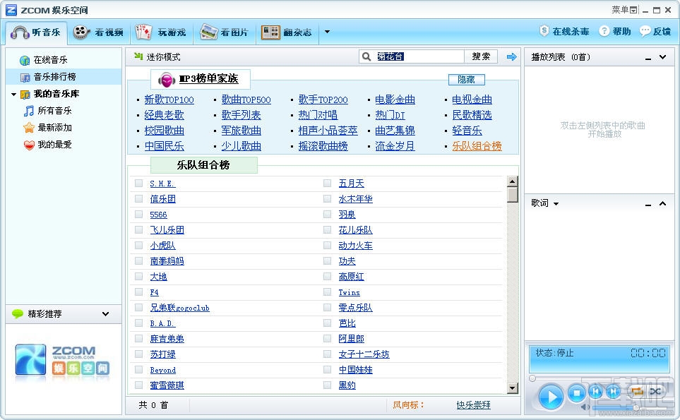 ZCOM娱乐空间是一款优秀的娱乐资源管理软件,具备高速下载、本地搜索、自动管理等实用功能。它能帮你轻松地找到电脑中曾经 听过的音乐,看过的视频、图片,玩过的小游戏,并且方便地播放和管理它们。ZCOM娱乐空间还免费提供《瑞丽》、《时尚》、《电影世界》、《国家地理》等电子杂志,让你享受最流行的的娱乐服务!主要特色:1.最全的歌词库,每日不断更新,播放歌曲时自动匹配相应的歌词信息;万首推荐歌曲,随意“搜听2.强大的视频点播系统,可以流畅的在线观看完整新大片。3.内置Flash视频播放器,起先支持下载Falsh格式的视频内容(FLV文件)4.提供超过5万个的经典Flash小游戏,并且支持本地保存,免除网络影响5.比较大的电子杂志发行平台,可以免费浏览、下载、订阅近万本精美杂志。