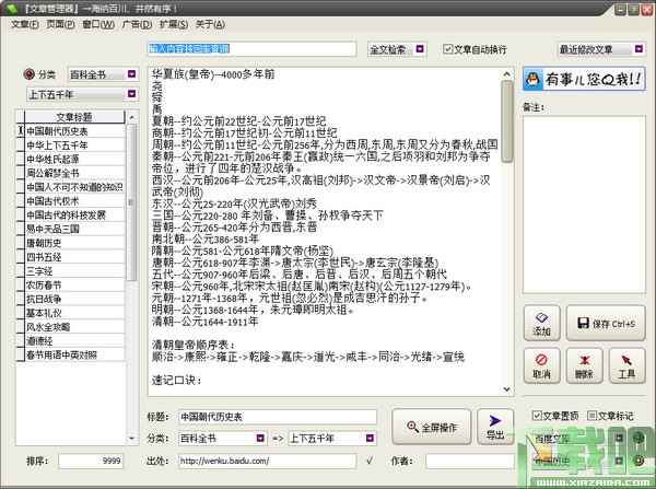 文章管理器的多分类、多子类帮助您管理不同领域的文章、学习笔记,每个分类/子类对应各自不同的网站链接,方便查阅资料或发表相关文章。文章管理器软件搜索功能可以快速查询您之前录入过的数据,免去一个个文件打开然后查找数据的麻烦,如果录入的资料未找到答案也可以让其搜寻网络。导入/导出功能可以使志同道合之人很方便的实现数据共享。