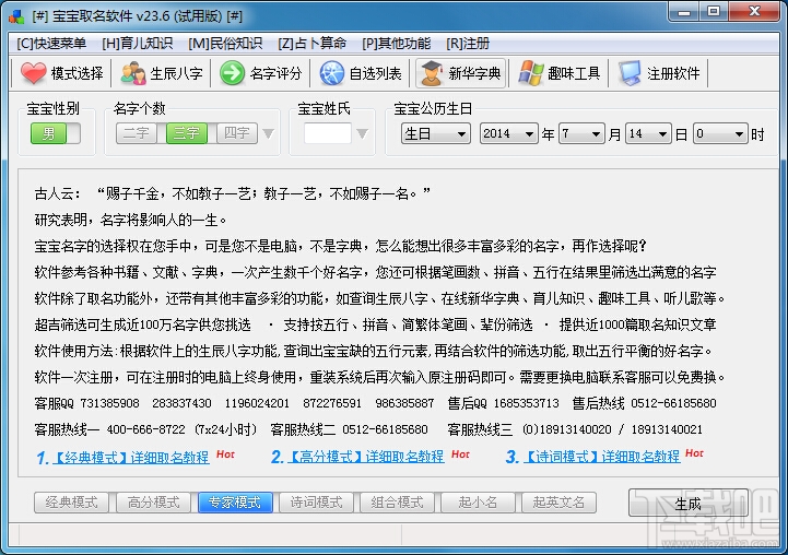 8.7 MB/2020-08-17高分五行生辰八字宝宝取名软件免费版是一款起名工具,软件有多种起名模式可以选择,有经典起名,高分五行起名,组名起名,小名起名等等。软件参照姓名学原理、八字、喜用神、名字吉凶、字辈、名字长度、文武、字型、音律、意义、美学、形象、起名心理学、起名禁忌、生肖、签名书写、天格、地格、人格、外格、总格、三才、成功运等诸多方面,从几百万个名字中,自动挑选出最匹配您孩子的几万个名字,评分达到99-100分,然后您