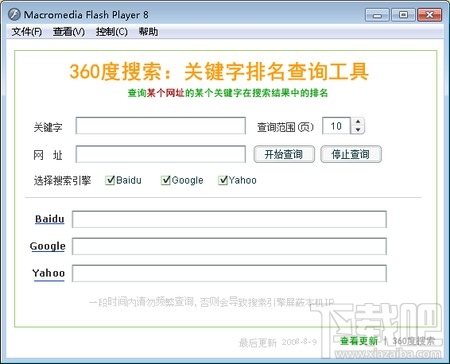 输入你需要监测的关键字和你的网址后,选择查询页范围,开始查询,即可看到关键词在百度、谷歌、雅虎的排名情况,点击搜索框后面的“e”,即可定位关键字在网页中的位置,自动搜索、记录排名的结果,对网站优化起到事..