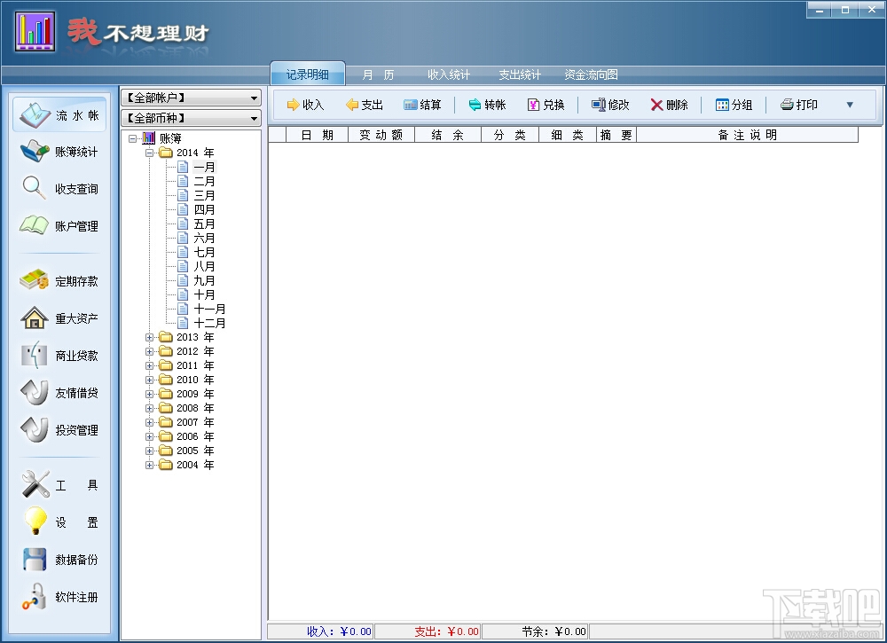 个人理财记账软件需要的是记录一些比较大的花费记录,对于比如乘公共汽车等一些零星花费,当然不必绞尽脑汁去想到底用了多少。作为用户的您,只需要在适当的时候,使用结算功能,结算一下您的现金余额,让计算机给您统计一个花费总额即可。《我不想理财!》作为一款个人家庭理财记账软件,现有主要功能如下:1.独有的现金结算功能。让您的理财更轻松。2.多帐簿功能。允许建立多个相互独立的帐簿。3.多币种功能。让您可以同时管理多个币种的数据,方便您管理您的资金。4.现金管理功能。这当然是理财记账软件的必不可少的功能了。5.强大的查询功能。提供了快速的分类查询模式,以及可以实现任意查询组合的详细查询模式两种查询模式。6.银行帐户管理功能。可直接从帐户上消费,比如刷卡消费等。7.银行帐户之间相互转帐功能。方便您在不同帐户之间调配资金。8.借贷管理功能。管理你借给别人的钱和向别人借的钱。9.资产管理功能。帮助你打理好你的资产,本理财记账软件不在话下。11.投资管理功能。假如您有闲钱进行投资,那么你也离不开这款理财记账软件。10.统计图表功能。图形显示统计结果,使您一目了然。11.现金和银行帐户可单独显示;也可综合显示,使总体收支情况更加明晰。12.收支分类功能。收入和支出可分别建立两级分类。13.数据导出功能。可将数据导出到Excel中,让Excel来协助您使用理财软件。14.打印功能。15.数据备份和恢复功能。16.提供理财工具集。让你理财更方便。