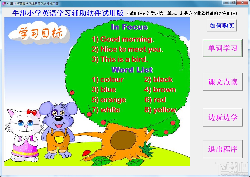 兴趣是孩子学习英语较好的老师.本软件是一款专门针对牛津小学英语课本辅助学生学习的软件,该软件结合课本内容,分为课文插图对话点读,单词点读,玩游戏学习英语三部分。英语读音标准清晰,孩子通过看图点读,模仿英语单词与课文读音以及玩英语游戏,很快会喜欢英语并能准确读出课本相关单词与句子,为孩子将来的英语学习打下良好的基础。同时,小学英语教师可以把该软件作为教学辅助工具,使自己的课堂更加生动更有吸引了。家长也可以使用该软件在家里辅导自己的孩子学习英语。牛津小学系列软件,从3A到6B都有。