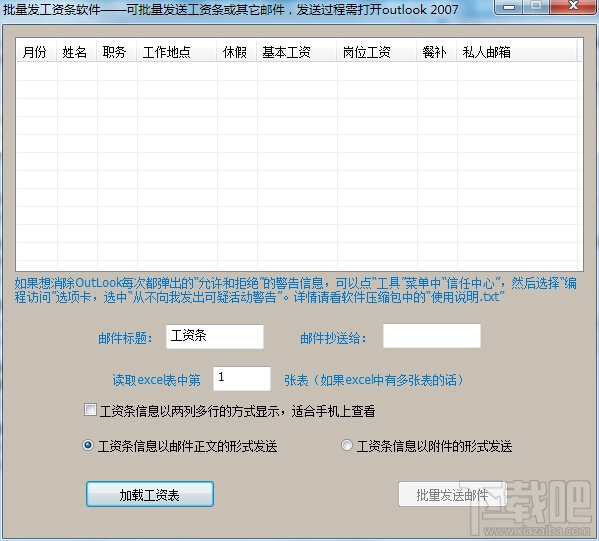 需要给很多人发送邮件(比如工资条、奖金或其它广告营销内容),又不能用群发的方式?以往完成这些任务一条一条复制、粘贴,发送,要花上一整天的时间?来试试这套系统吧,先配置好需发送的内容(邮件支持html的正文格式以及excel附件),加载数据表后,只需点击一下“批量发送邮件”,就可以轻松完成以往所有的繁杂工作。本软件利用微软的OUTLOOK来批量自动发送邮件,成功率比其他任何一款邮件客户端都高,是推广网站、网店、博客、论坛的营销利器。