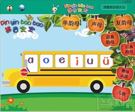 “拼音宝宝”主要包括单韵母、声母、复韵母、前鼻韵母、后鼻韵母等拼音学习及相应的诗歌,还包括整体认读、儿歌学习等,声音与动画配合得惟妙惟肖,能够使儿童快乐学拼音、唱儿歌。