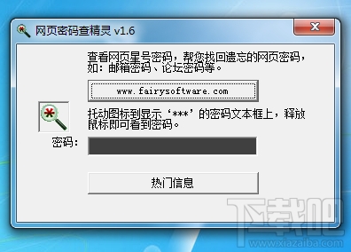 网页密码查看精灵是一款用于查看网页星号密码的工具,网页密码查看精灵能够帮您找回遗忘的网页密码,如:邮箱密码、论坛密码等。