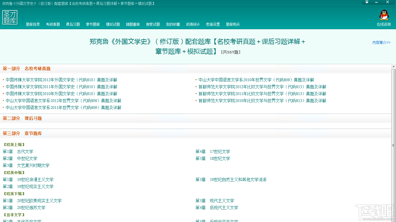 不同一般意义的传统题库,本题库是详解研究生入学考试指定考研参考书目为郑克鲁《外国文学史》(修订版)的专业课复习题库,包括考研真题、课后习题、章节练习和模拟试题四大部分。新历年考研真题及视频,可免费升级获得。具体来说包括以下四部分: