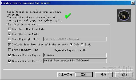 给了你一次在十二步中就能拥有自己网页的机会。你只需要回答WebDummy!设置的问题,按下完成按钮,你的网页就做好啦。WebDummy!在把文件保存为HTML格式时,会同时建立一个.dat的文件,以后可以在一开始直接打开这个.dat文件来修改网页。
