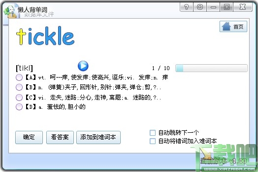 懒人背单词打破传统书本记忆的局限,运用多种记忆模式,让用户由被动地记,转为主观地想。而且充分调动了耳朵、手、大脑、全方位、多角度,刺激你的记忆细胞,让你想忘都忘不掉!不管你觉得自己记忆力多么差,亦或是学习多么懒,“懒人背单词”都将你的词汇量直线上升,因为它就是专门为懒人设计的!覆盖了CET4、CET6、考研、托福、雅思等等词汇,而且整个软件不到1M,启动速度还超快。