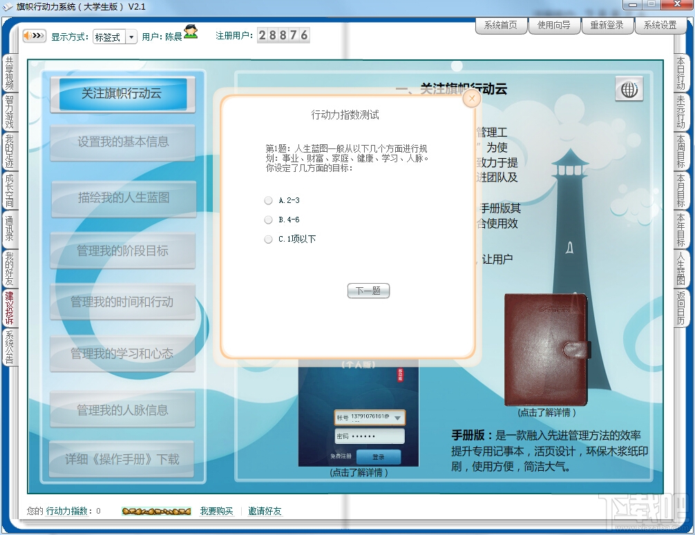 旗帜行动力系统是山东旗帜软件股份有限公司开发的一款个人管理软件,是国内第一套面向大学生、职业人士与企业,专业提供行动力服务的工具。软件以五项管理(时间管理、目标管理、学习管理、心态管理及行动管理)为基础,六大科目(事业、财富、家庭、人脉、健康、学习)为角度,三位一体(PC版、手机版和手册版)为方法,帮助用户全面提升行动力,达成目标和梦想,全方位立体化的阐释了管理学中的技术管理。旗帜行动力系统在第十四届国际软博会中“旗帜行动力系统”荣获创新奖。