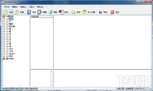《云竹诗词大典》是古今中外经典诗词、诗歌的浏览及管理软件,系统是免费软件,共收集中外著名诗词六万四千余首,合计中外作家四千七百余人。系统由“中国历代诗词”、“外国诗集”两大模块组成,其中中国历代诗词部份包括了先秦至现当代四千余位中国著名诗词作家的代表作品,外国诗集部份收集了近30个国家著名诗人的经典作品。随系统附送Mid音乐若干,您可以一边听着优美的音乐,一边欣赏古往今来浩如烟海的诗词!