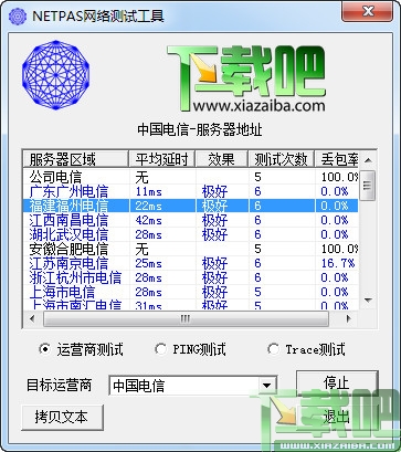NETPAS网络测试工具具有运营商测试、Ping测试和Trace测试功能。使用NETPAS网络测试工具可以判断网络质量的好坏,自带电信、网通、教育网、铁通等测试服务器地址,用户也可以修改ini配置文件自定义服务器地址。