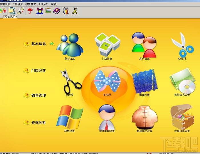 一.基本信息:1.部门设置 2.员工信息 3.客户信息 4.项目设置 5.衣柜设置 6.颜色设置7.瑕癖设置 8.修改方式设置 9.服装部位设置 10.服饰类别设置。