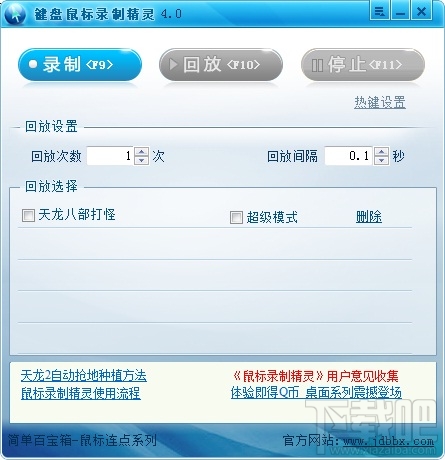 此工具可以记录您键盘鼠标的所有操作并进行重放,录制过程会记录下所有的鼠标和键盘操作,包括两次击键间的时间间隔和普通鼠标的移动轨迹和键盘的任何按键。 可以利用此工具在网络游戏中实现自动施放技能、自动行走等功能。
