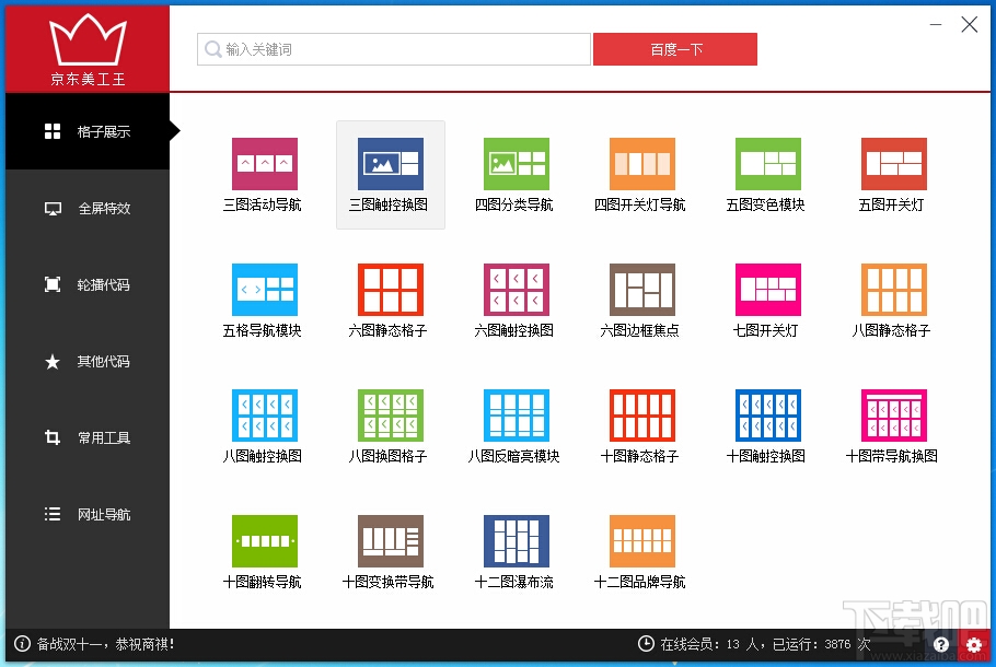 京东美工王软件能生成全屏装修代码、固定背景代码、全屏海报、反暗亮模块、悬停切图、卡盘轮播、缩略图轮播、滚动轮播、底部卡盘轮播、右侧卡盘轮播、多图格子轮播、多图宝贝秀、方块导航轮播、等近百种特效代码,软件具有预览、编辑等功能,软件集成京东美工常用的素材网站、学习网站,便于快捷访问。