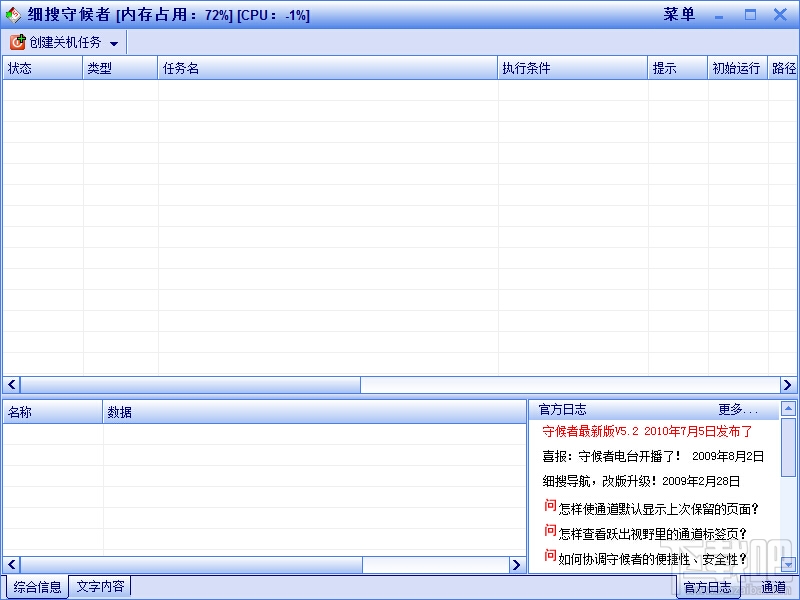 细搜守候者是一款免费的专业级定时关机软件,满足各种对定时关机有需求的用户;目前已有定时关机、定时打开文件(如程序、音乐、文本等等)、定时关闭窗体程序等三种任务类型,及倒到记时、定时、空闲等三种控制类型,在后续版本中,将会有更多的类型,敬请关注;可以多线程运行无数个任务,并且在任务执行前,会弹出友好的提示框,提醒你注意手上的工作;可以自动记录任务(关机、打开文件)信息,各种类型的任务组合起来使用,将会发挥更大的便捷性;友好大气的用户界面,随意的操控及快捷键操作,使你操作起来更加轻松愉快!