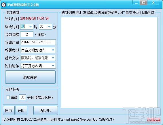本软件为免费软件,欢迎自由拷贝。主要特点——个性应用,不做寻常闹钟:1.可添加个无数个闹钟,每个闹钟可设置不同动作。2.可针对不同环境设置不同提醒模式,自定义闹铃、提示文字。3.软件关闭后重启,闹钟仍然有效,智能清除过期闹钟。4.创新定时运行程序、定时关闭QQ/MSN/IE、定时关机等贴心功能。5.具备运行时间统计、定时休息提醒等功能,倡导健康低碳新生活。6.完全免安装绿色软件,解压即可使用。可随电脑自启动,后台运行。