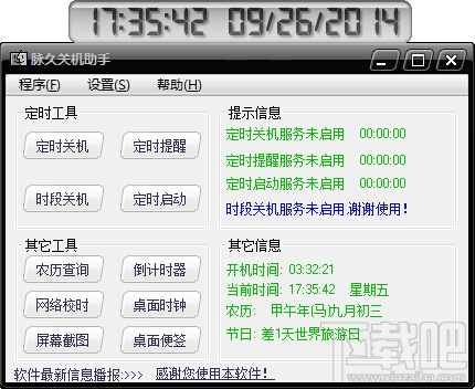 脉久关机助手是一款支持四种关机方式,1自定义时间、2延迟时间、3开机时间、4无操作时的关机工具。软件还有:农历查询,网络校时,上网导航,倒计时器,桌面便签,桌面时钟的功能。【脉久关机助手软件功能】自定义时间:设置自定义时间,当当前系统时间等于您设定的时间时,将会执行您预定的操作(关闭计算机)(重启计算机)(注销计算机);延迟时间:设置延迟时间即从当前时间等待多久后,执行您预定的操作(关闭计算机)(重启计算机)(注销计算机);开机时间:设置当您的计算机开机多长时间之后,执行您预定的操作(关闭计算机)(重启计算机)(注销计算机);无操作时:设置当您的计算机键盘鼠标无操作多长时间后,执行您预定的操作(关闭计算机)(重启计算机)(注销计算机)